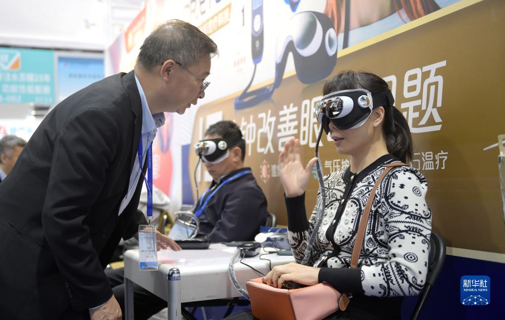 11月17日,觀眾在展會上體驗一款眼部護理儀。
