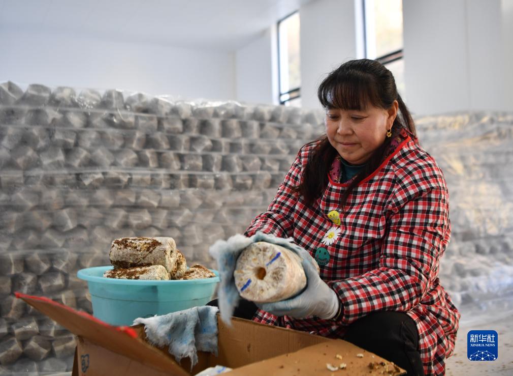 11月17日,農戶在寧陜縣城關鎮一處香菇種植園區處理香菇母種。
