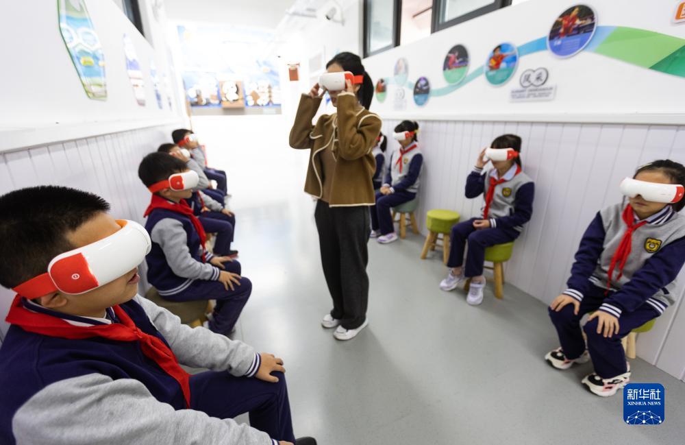 11月17日,在成都市迎賓路小學健康空間,健康老師帶領學生體驗眼睛按摩儀。