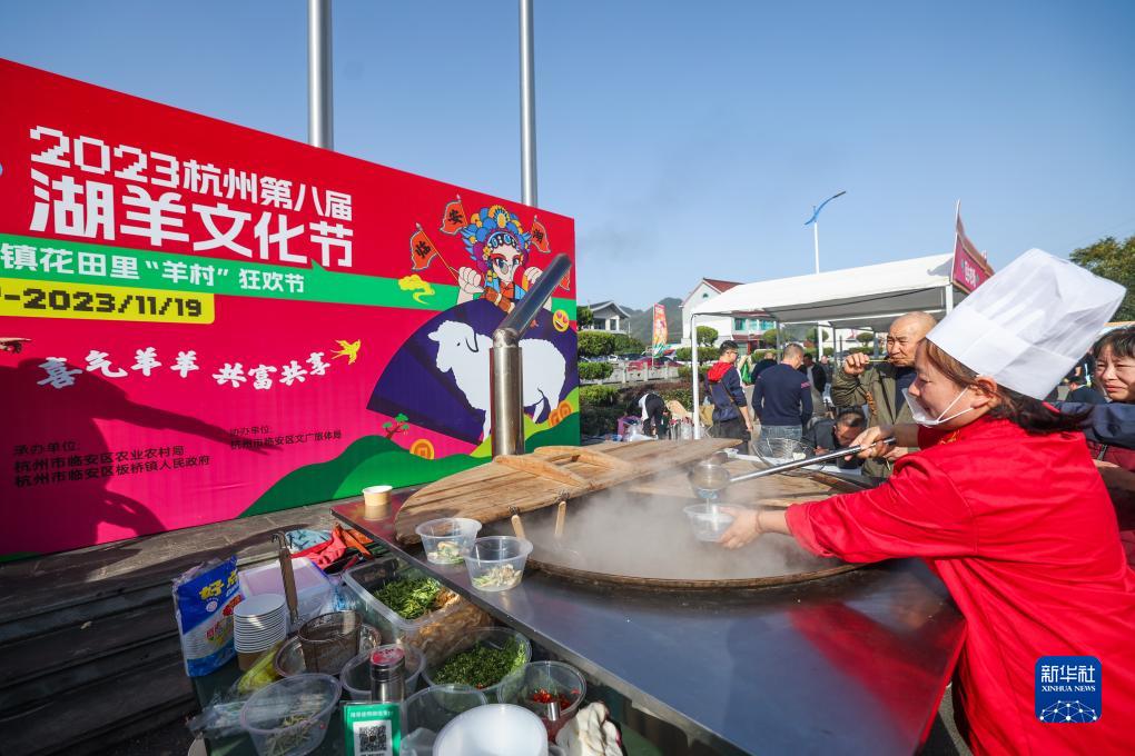 11月17日,商戶在板橋鎮花戲村的湖羊文化節鄉村市集上烹飪湖羊美食。