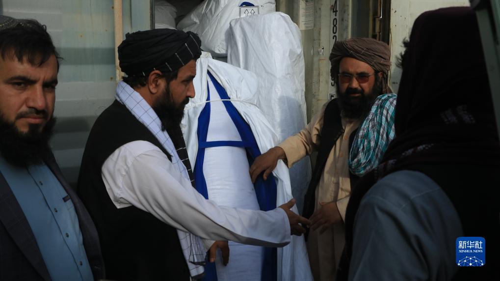 11月16日,在阿富汗西北部赫拉特省托爾貢迪口岸,阿富汗官員展示中國援阿抗震救災物資。