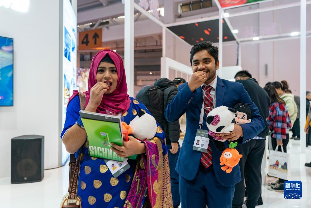 11月17日,兩名來自孟加拉國的參展商在2023中國國際旅游交易會上品嘗來自新疆的紅棗。