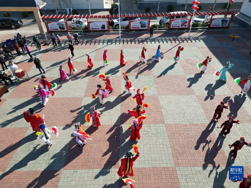 11月17日,河北省灤州市葛莊村地秧歌隊隊員在村廣場上表演(無人機照片)。