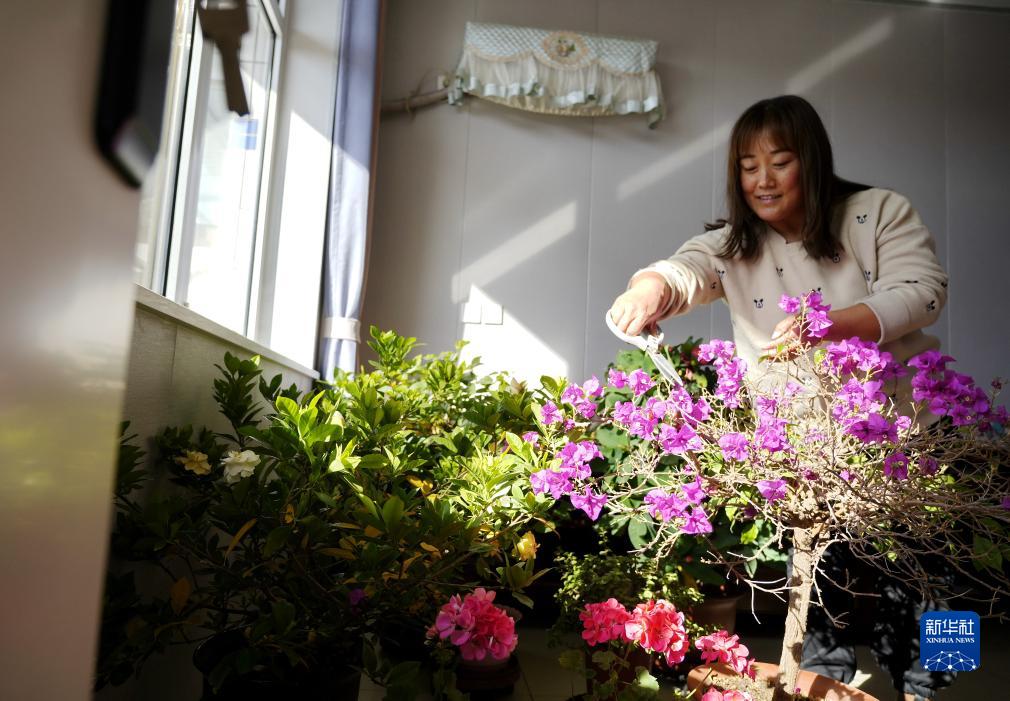 11月17日,河北省灤州市葛莊村一處“美麗庭院”示範戶的居民在打理種植的花卉。