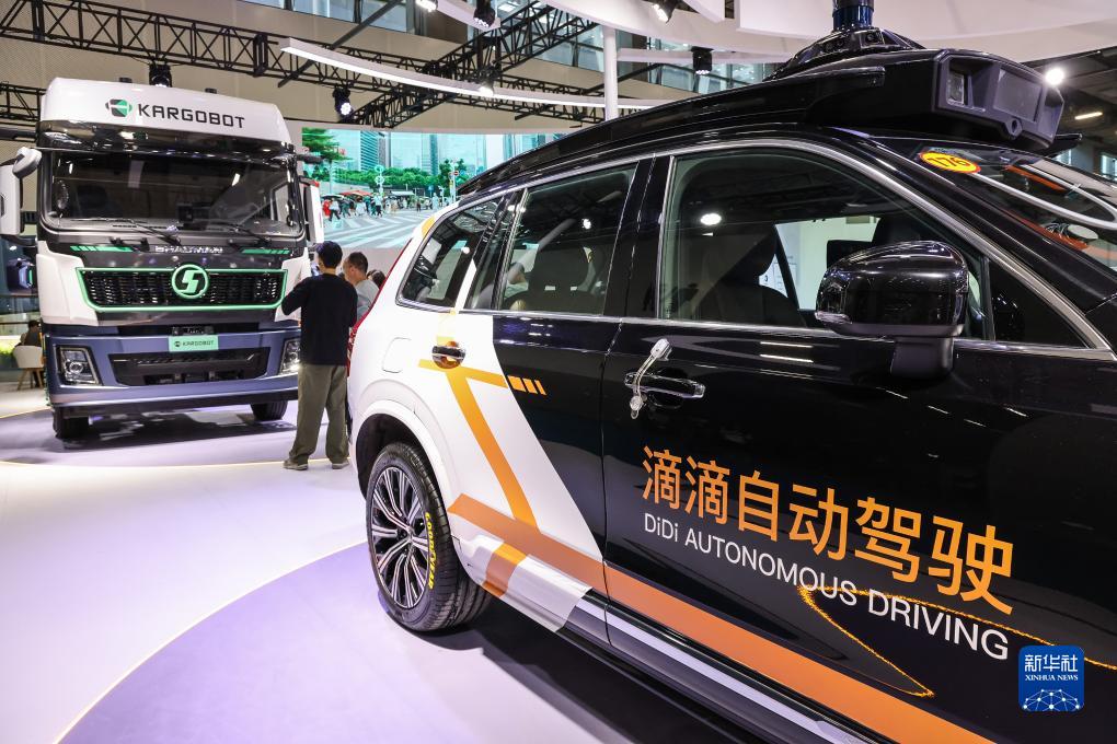 11月17日,滴滴自動駕駛在廣州車展展示已經投入運營的自動駕駛網約車和新能源自動駕駛卡車。