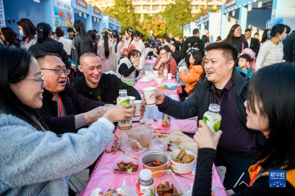 11月17日,在第四屆荊楚鄉村文化旅游節集市上,游客在品嘗美食。