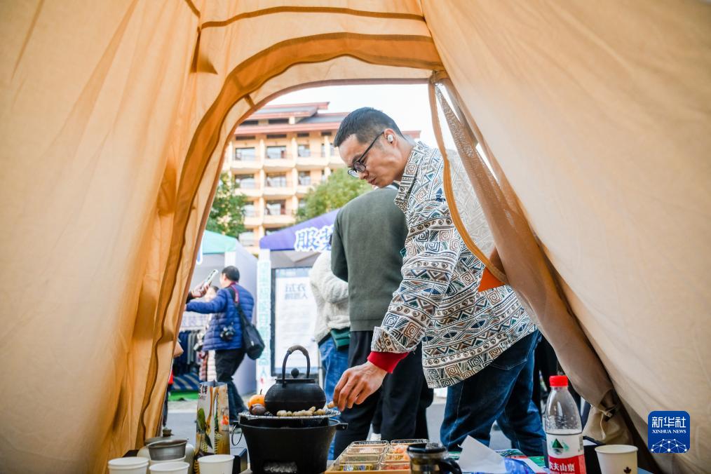 11月17日,在第四屆荊楚鄉村文化旅游節集市上,游客在體驗露營圍爐煮茶。