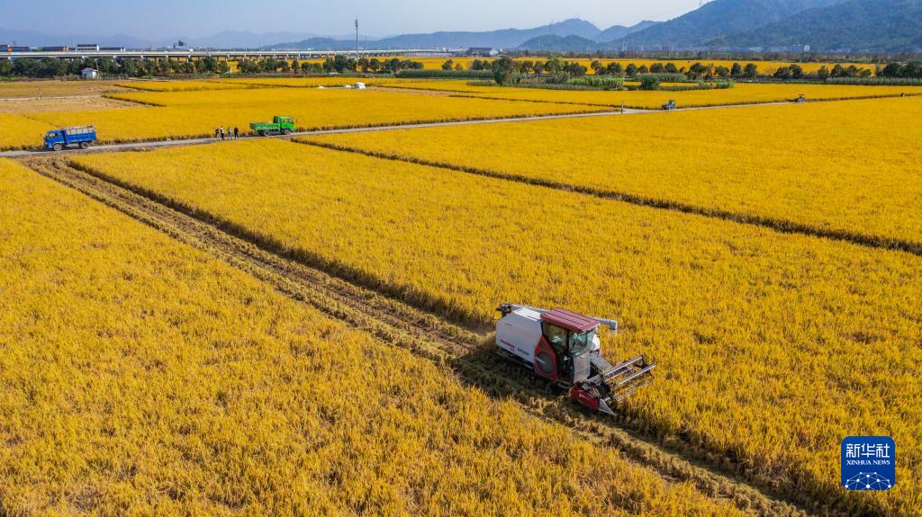 11月17日,在浙江省瑞安市馬嶼鎮天井垟糧食生産功能區,農民駕駛收割機搶收晚稻(無人機照片)。