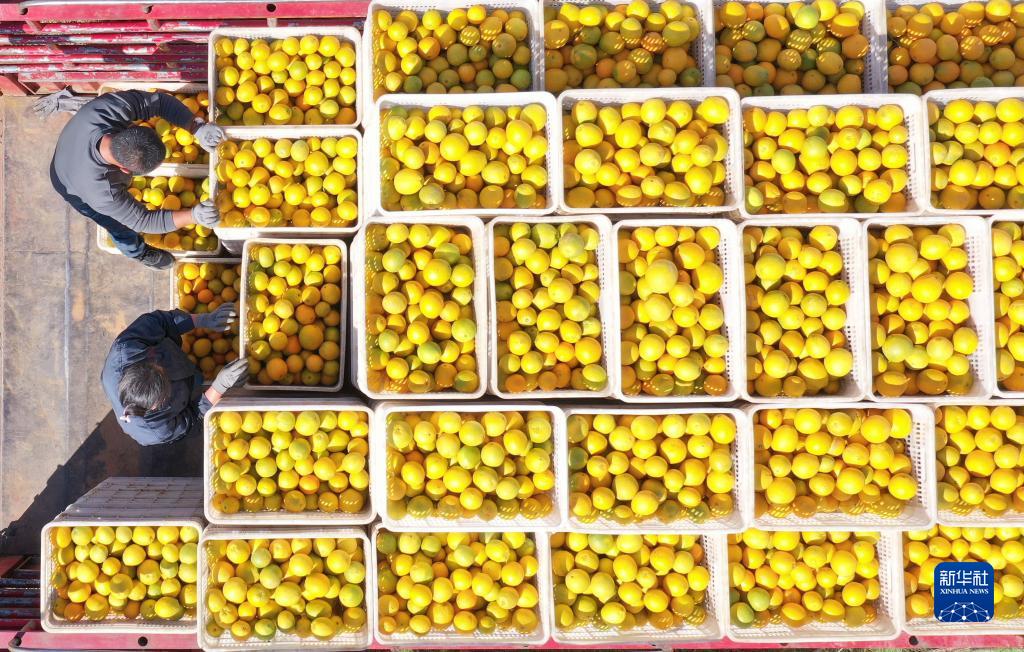 11月17日,在湖南省永州市道縣東門街道新立村,果農將臍橙裝車(無人機照片)。
