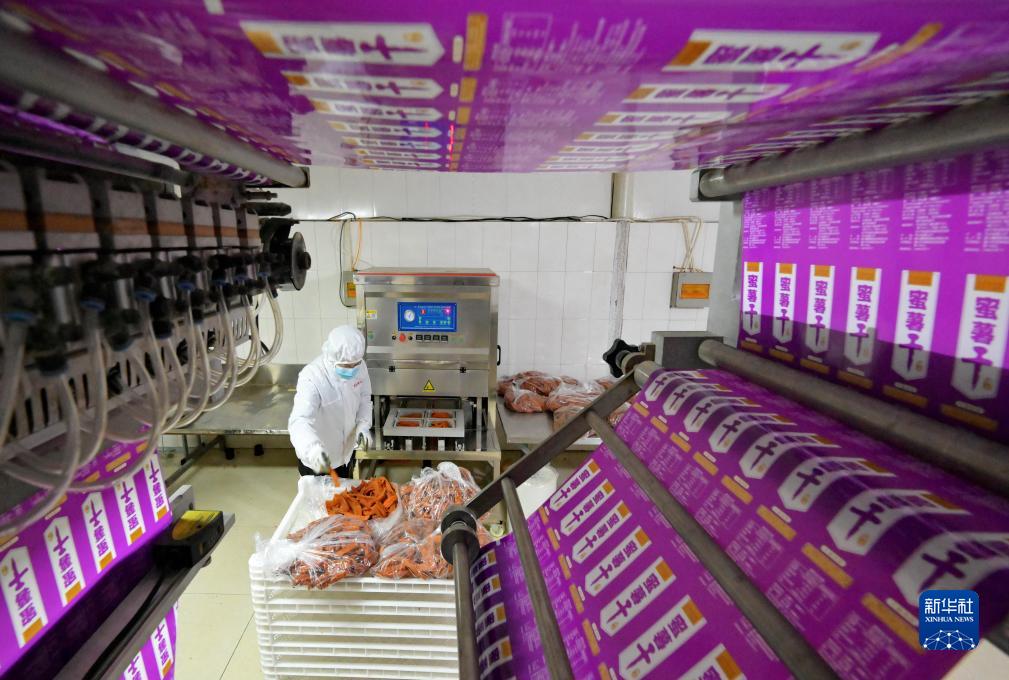 11月17日,河北省灤南縣安各莊鎮一家食品公司的工人在紅薯條包裝車間工作。