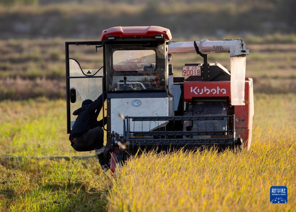 農機手準備操作收割機在稻田裏收割水稻(11月17日攝)。