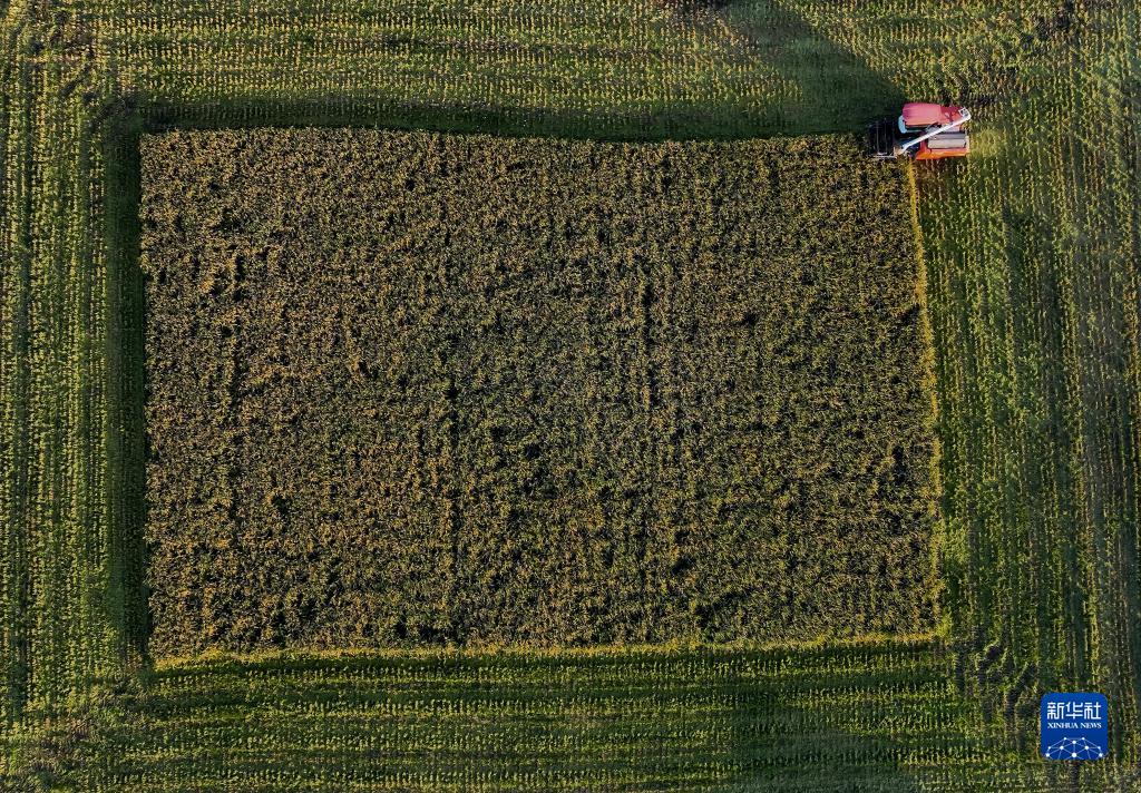 農機手駕駛收割機在稻田裏收割水稻(11月17日攝,無人機照片)。