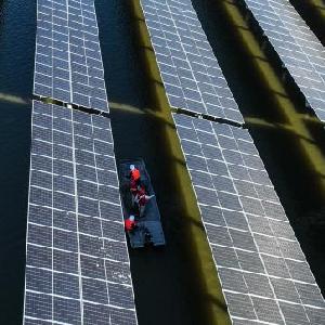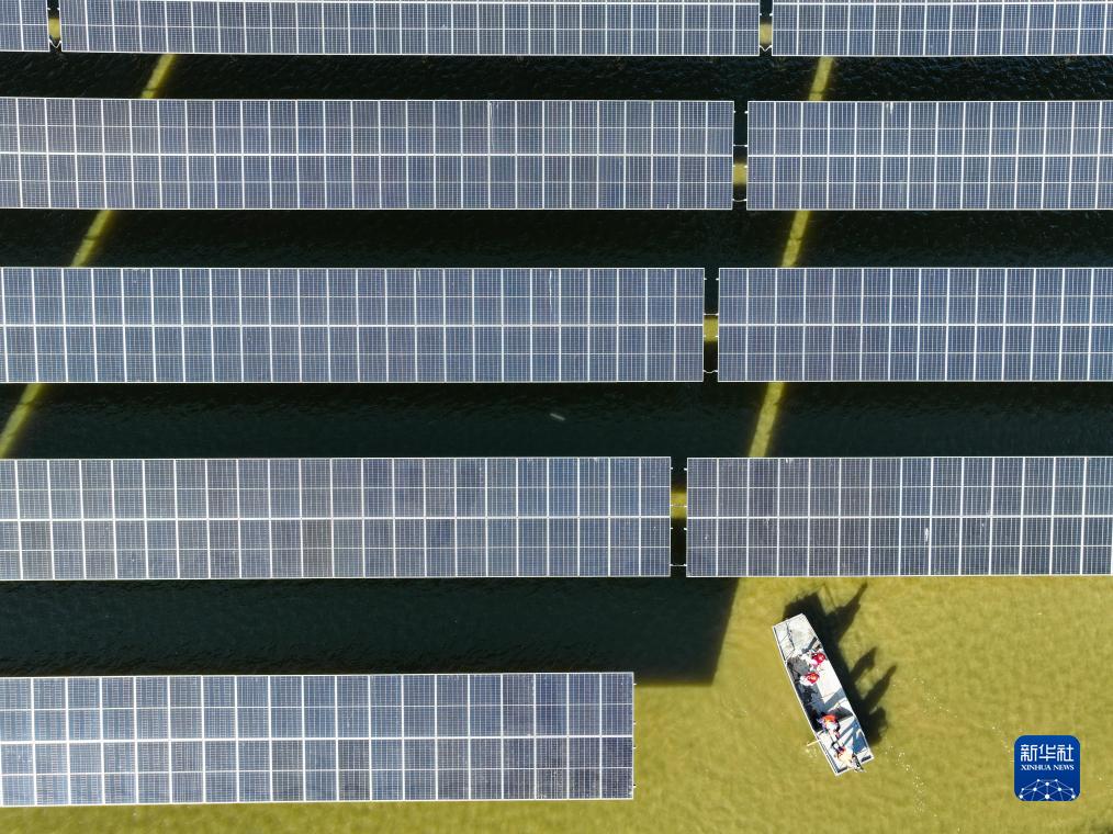 11月17日,在連雲港市灌雲縣圩豐鎮洋橋村,國網連雲港供電公司員工對漁光互補發電項目進行巡檢(無人機照片)。