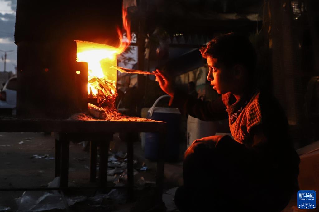 11月11日,一名男孩在加沙地帶南部城市汗尤尼斯街頭用柴火做飯。