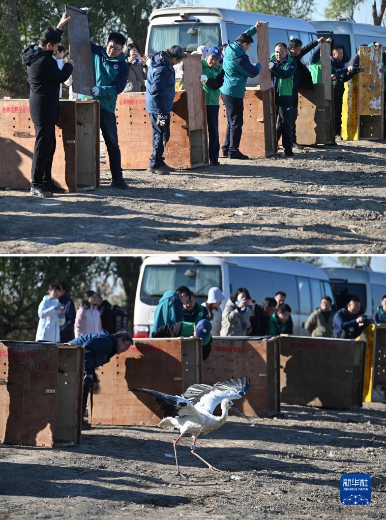 11月18日,工作人員打開木門將東方白鸛放歸自然(拼版照片)。