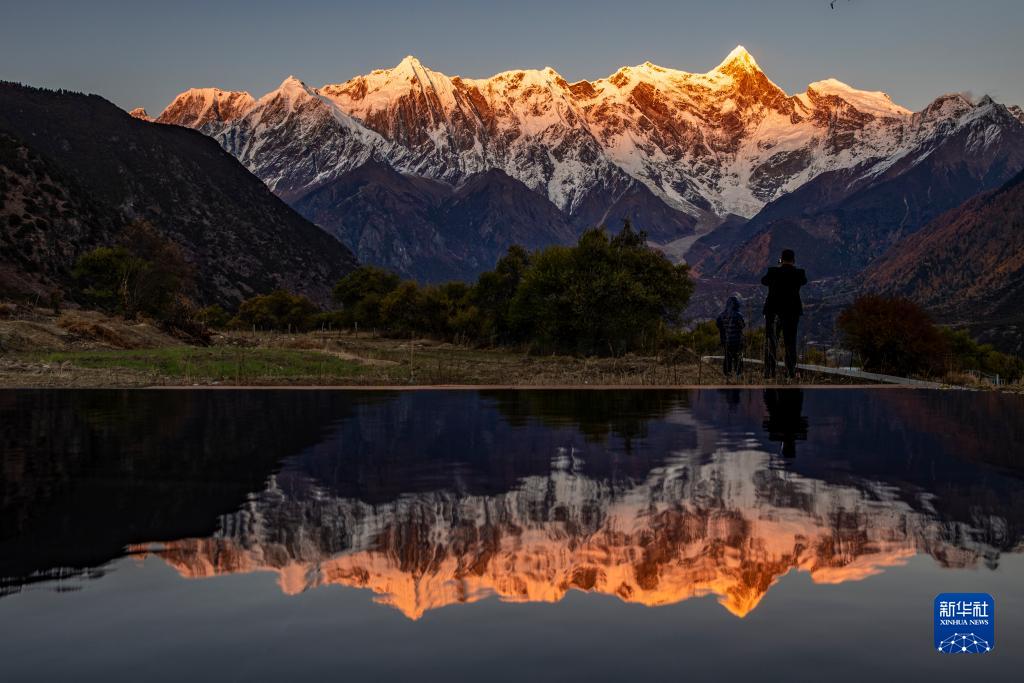 11月13日,游客在索松村拍攝日落時分的南迦巴瓦峰。