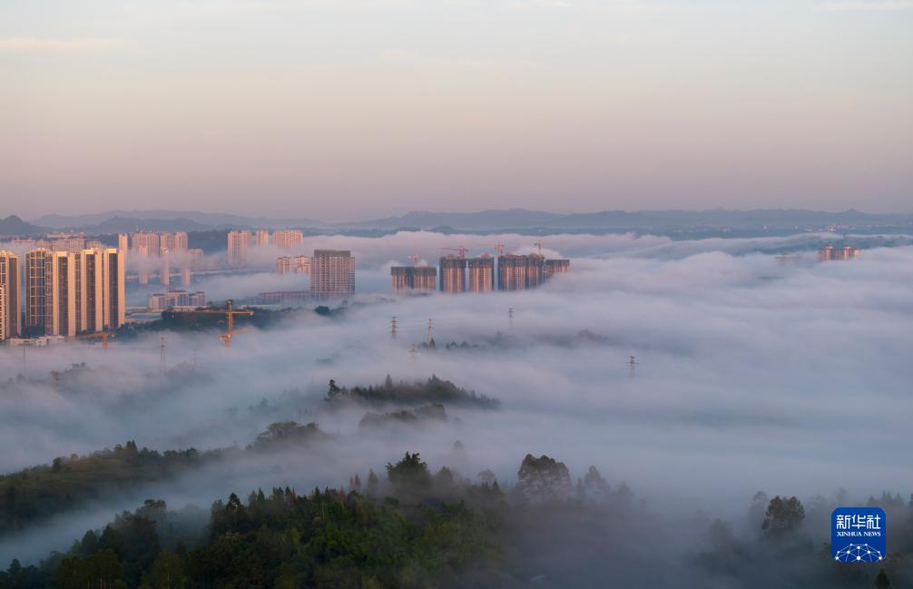 11月17日拍攝的四川省廣安市平流霧景觀(無人機照片)。