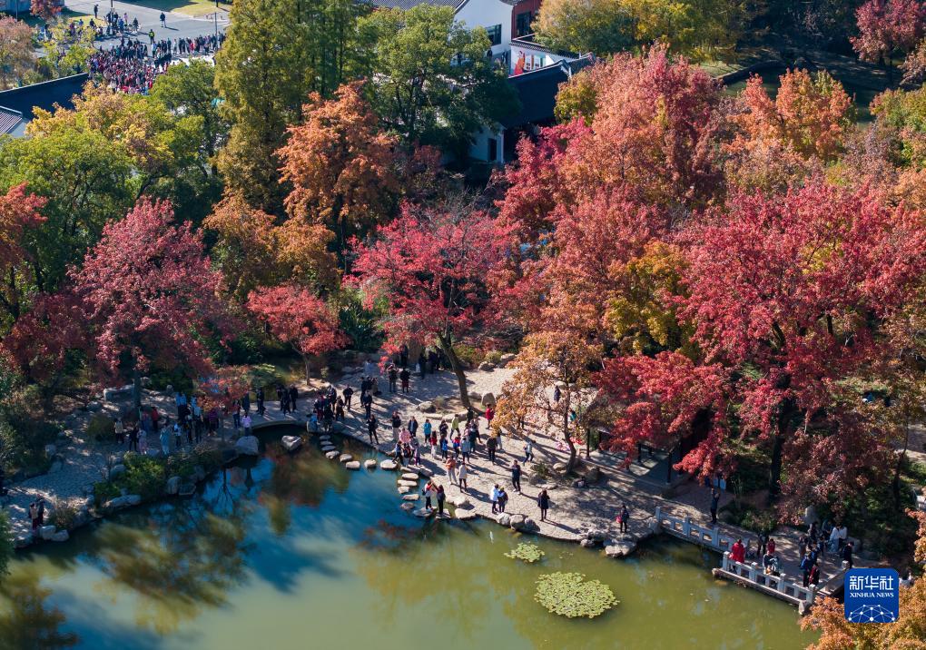 11月18日,游客在江蘇省蘇州市天平山風景名勝區觀賞楓葉景觀(無人機照片)。