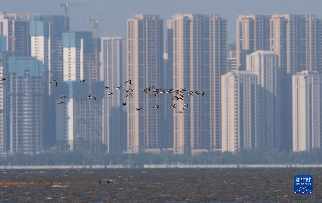 一群水鳥在泉州灣河口濕地上空翱翔(11月18日攝)。