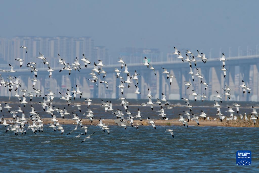 一群反嘴鷸在泉州灣跨海大橋海域上空飛翔(11月18日攝)。
