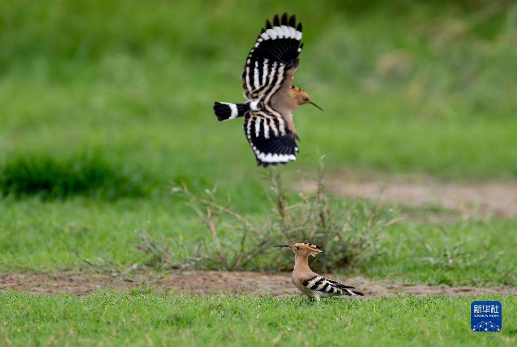 兩隻戴勝鳥在福州長樂閩江河口濕地打鬧嬉戲(11月15日攝)。