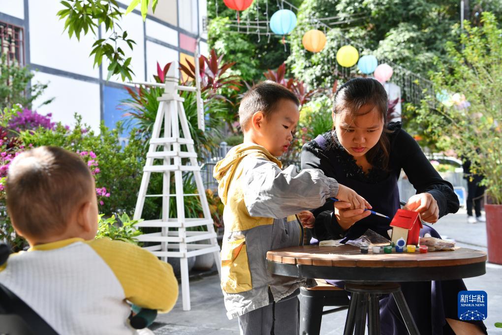 11月19日,在“兒童友好藝術村”深圳市龍華區上圍村,一名家長陪着孩子做手工。