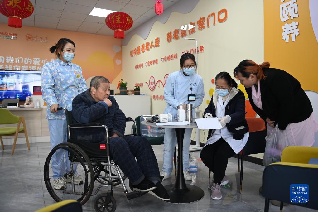 11月19日,在慈溪市白沙路街道居家養老服務中心,81歲老人吳森泉(左二)在接受免費助浴服務前進行身體狀況檢查。