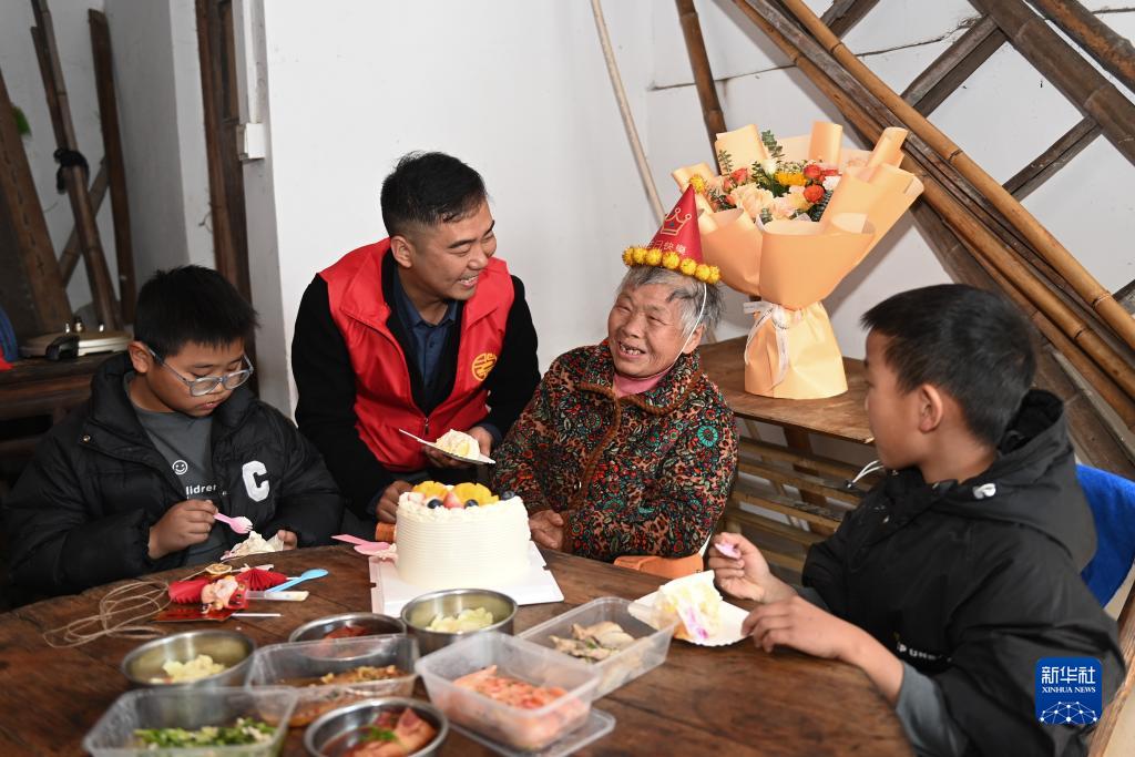 11月19日,在慈溪市白沙路街道隆興村,居家養老服務中心的志願者為74歲的低保獨居老人盧鳳娣提供送餐服務,並為老人祝賀生日。慈溪市全面實施、推進老年助餐服務“倍增”計劃,目前每日助餐服務7000餘人次,覆蓋全市所有村(社區)。