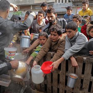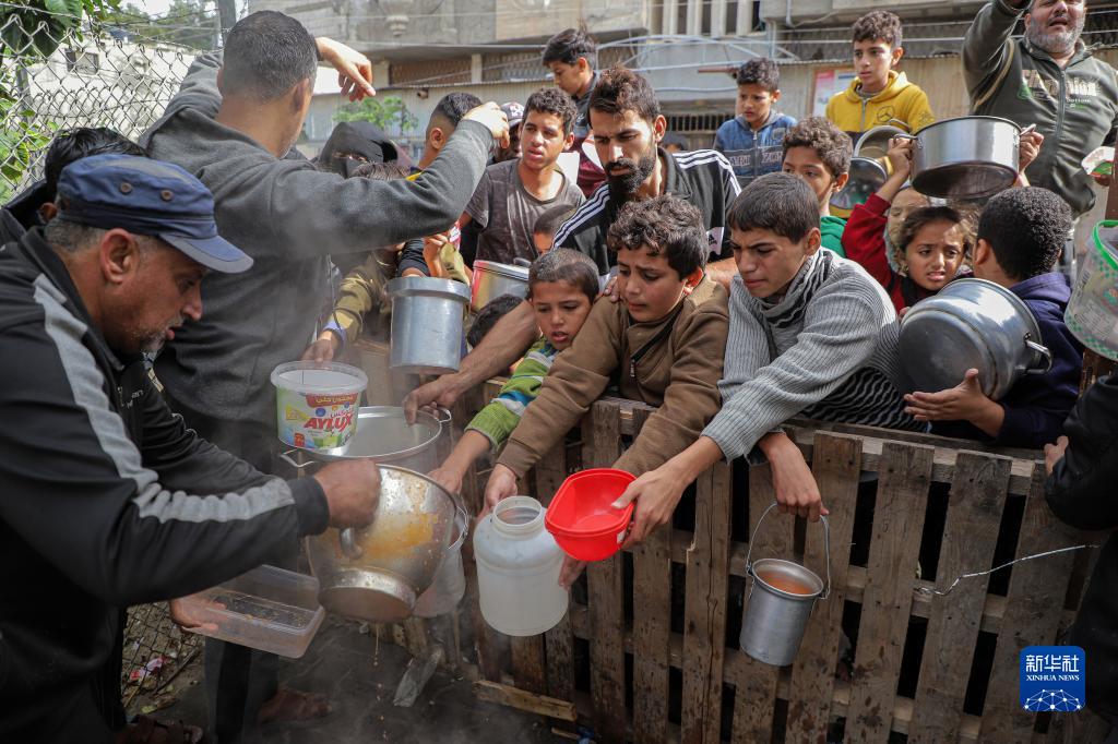 11月19日,在加沙地帶南部城市拉法,人們領取救濟食物。