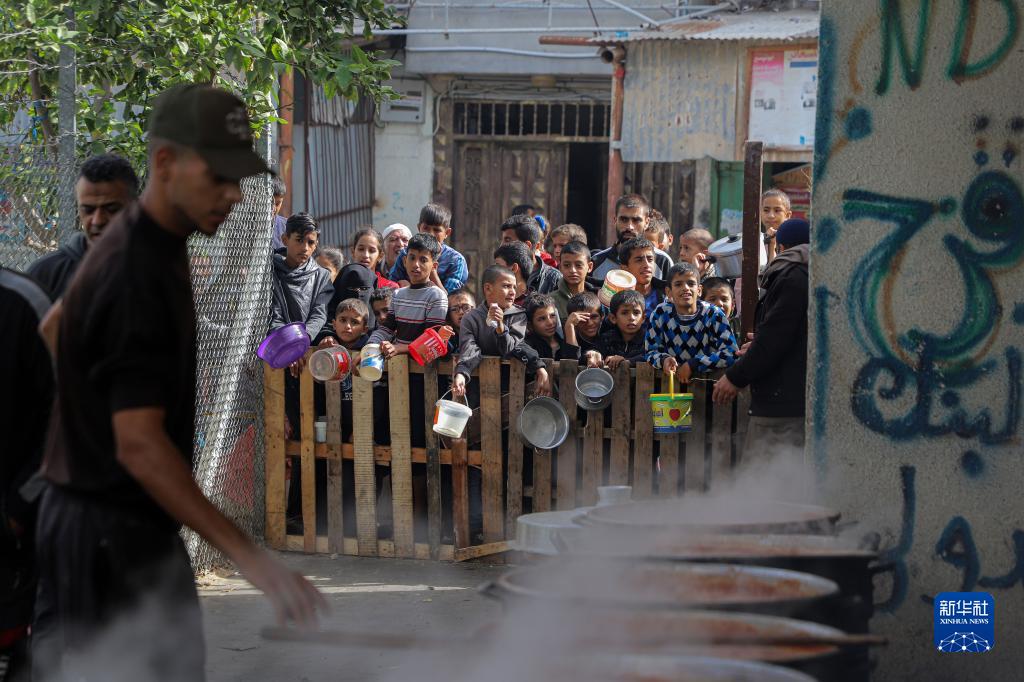 11月19日,在加沙地帶南部城市拉法,人們領取救濟食物。