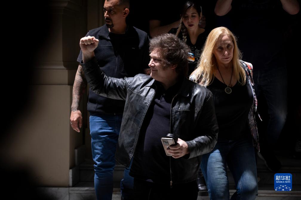 11月19日,阿根廷極右翼選舉聯盟“自由前進黨”候選人米萊在阿根廷首都布宜諾斯艾利斯的一處投票站向民眾致意。