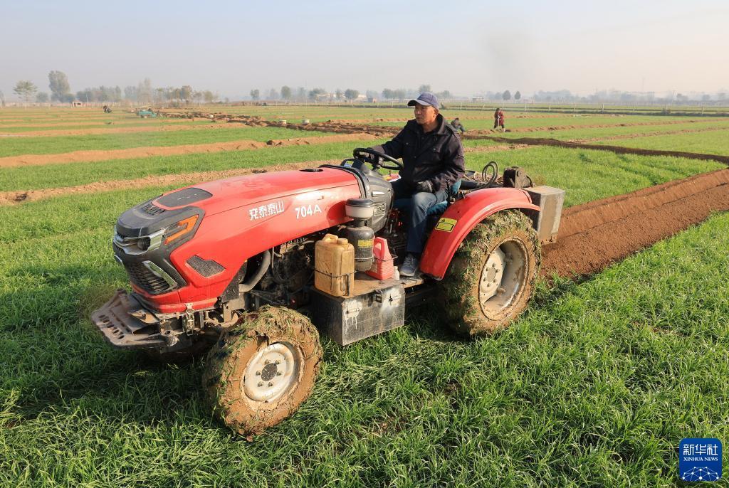 11月20日,農機手駕駛農機在河北省晉州市周家莊鄉第七生産隊的田間開溝,準備安裝噴灌設施。