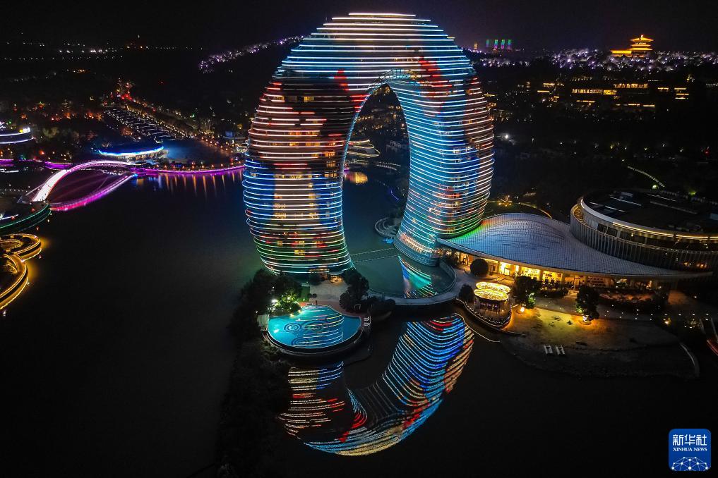 11月20日,在浙江省湖州市南太湖新區月亮灣,當地地標建築為世界兒童日亮燈(無人機照片)。