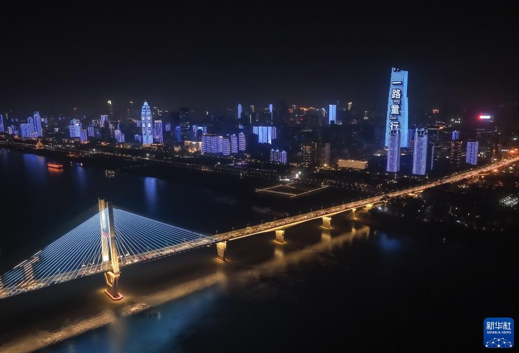 11月20日,武漢長江二橋、長江兩岸建築為世界兒童日亮燈(無人機照片)。
