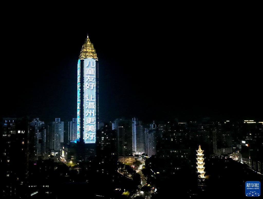 11月20日,浙江省溫州市地標性建築世貿中心大廈為世界兒童日亮燈(無人機照片)。
