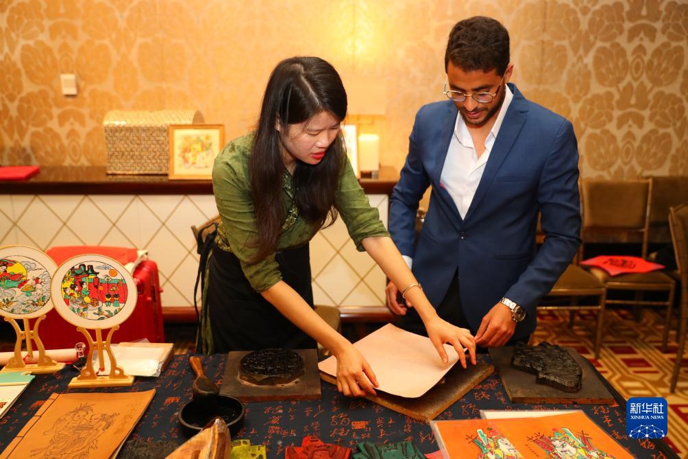 11月19日,在埃及開羅舉行的粵港澳大灣區世界級旅游目的地推介暨“魅力廣東”視覺展上,一名男子在非遺展區體驗木板年畫製作。
