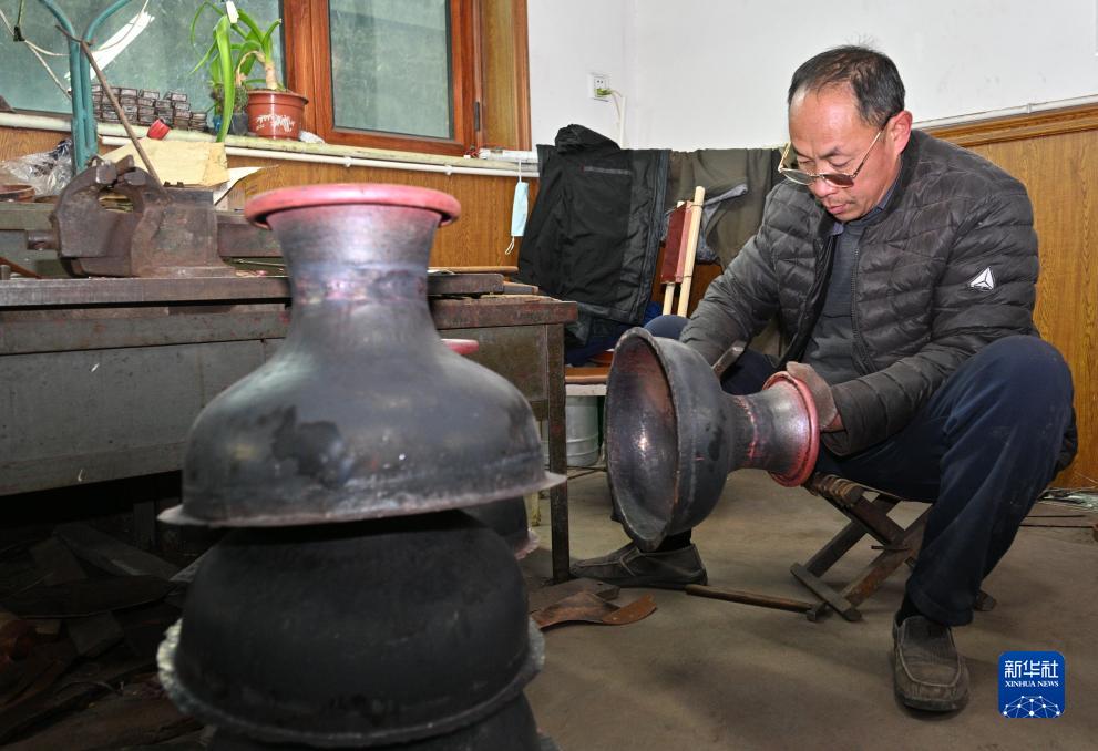 11月20日,在饒陽億澤景泰藍工藝品廠,工人為一件景泰藍製品制胎。