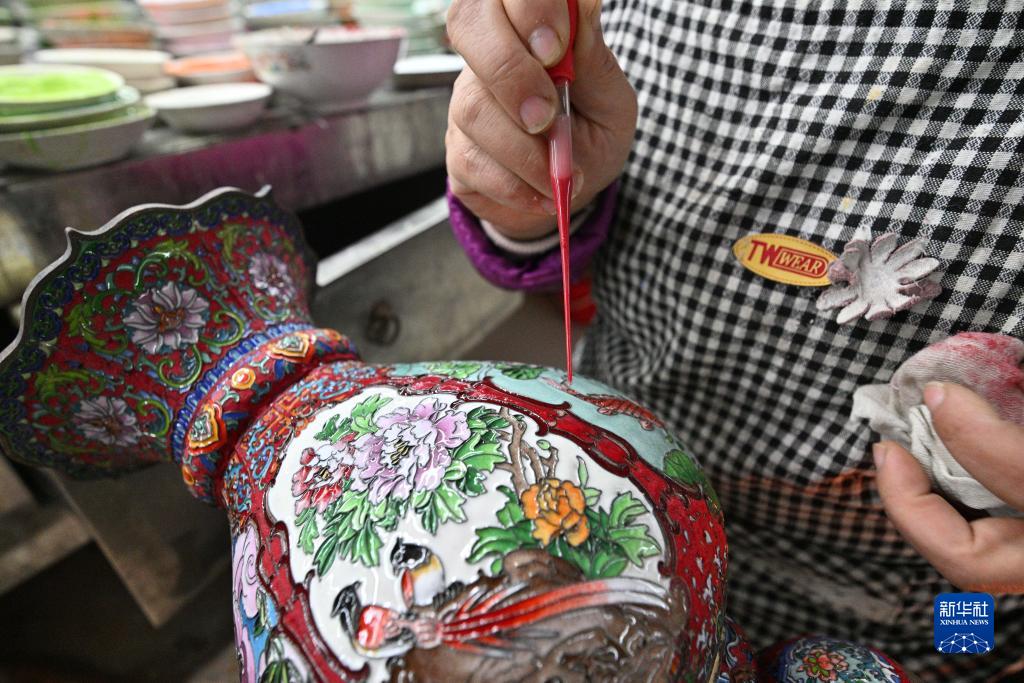 11月20日,在饒陽億澤景泰藍工藝品廠,工人為景泰藍製品“點藍”。