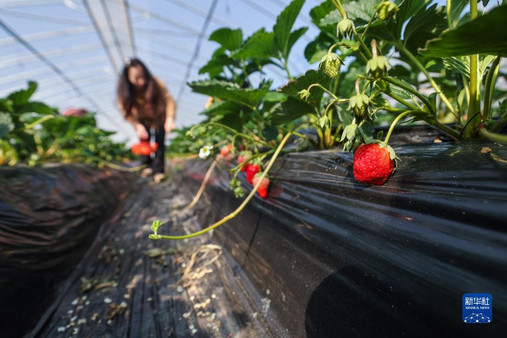 在浙江省建德市更樓街道“更有味”草莓共富合作工坊大棚內,“頭茬”早熟草莓搶鮮上市。莓農們忙着采收新鮮草莓,通過快遞發往杭州、上海等多地市場。