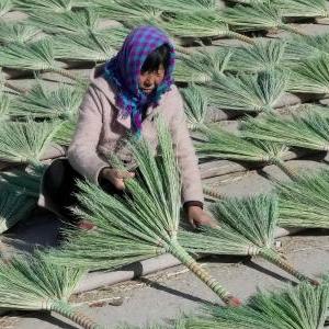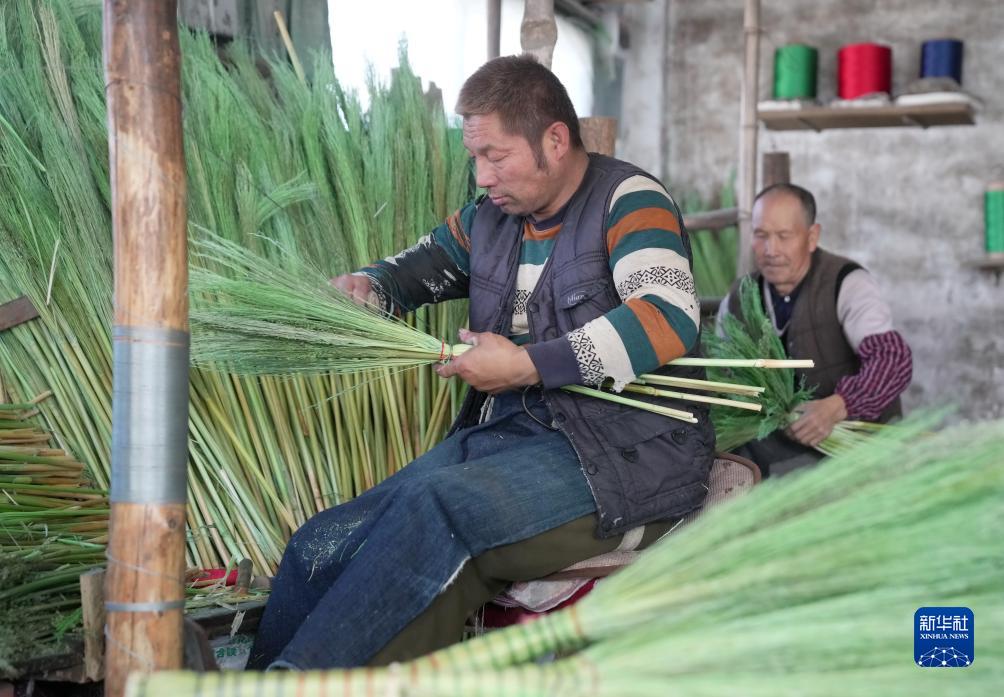 11月21日,河北省樂亭縣毛莊鎮一家笤帚專業合作社的社員在製作笤帚。