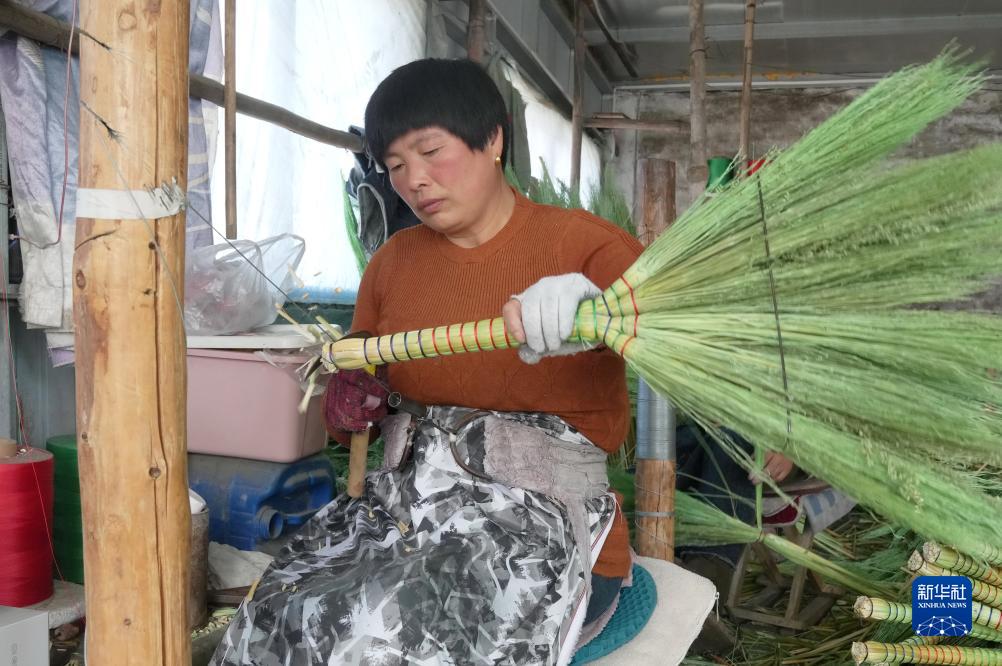 11月21日,河北省樂亭縣毛莊鎮一家笤帚專業合作社的社員在製作笤帚。