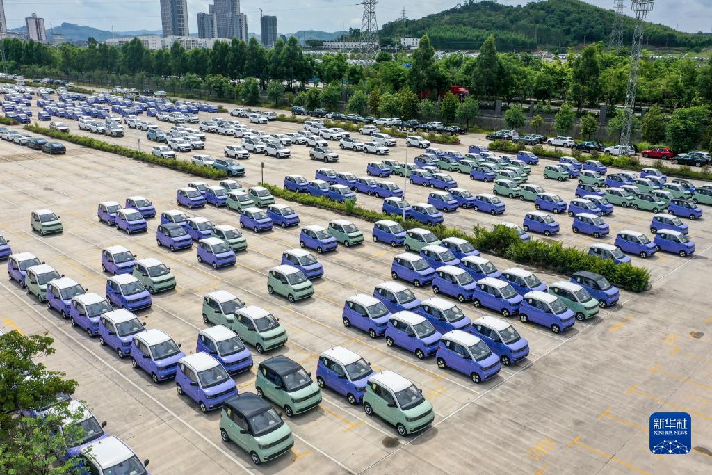 這是位於廣西柳州市的雒容汽車物流基地,一些出口的新能源汽車從這裡裝車運往各大出海港口(7月19日攝,無人機照片)。新華社記者 曹祎銘 攝