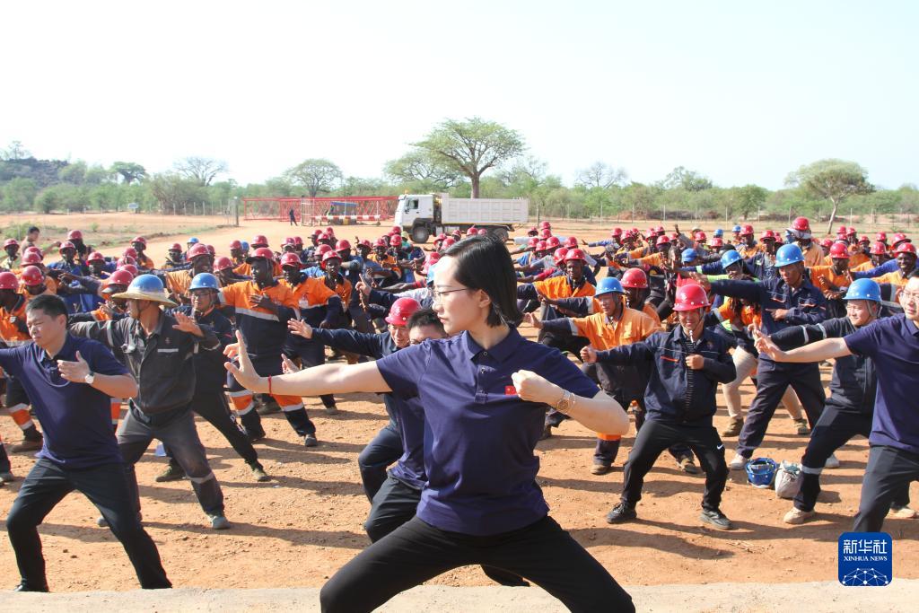 11月21日,在津巴布韋南部邊境地區的新太資源棕櫚河冶金産業園,中國醫療隊隊員帶領中企員工做八段錦。