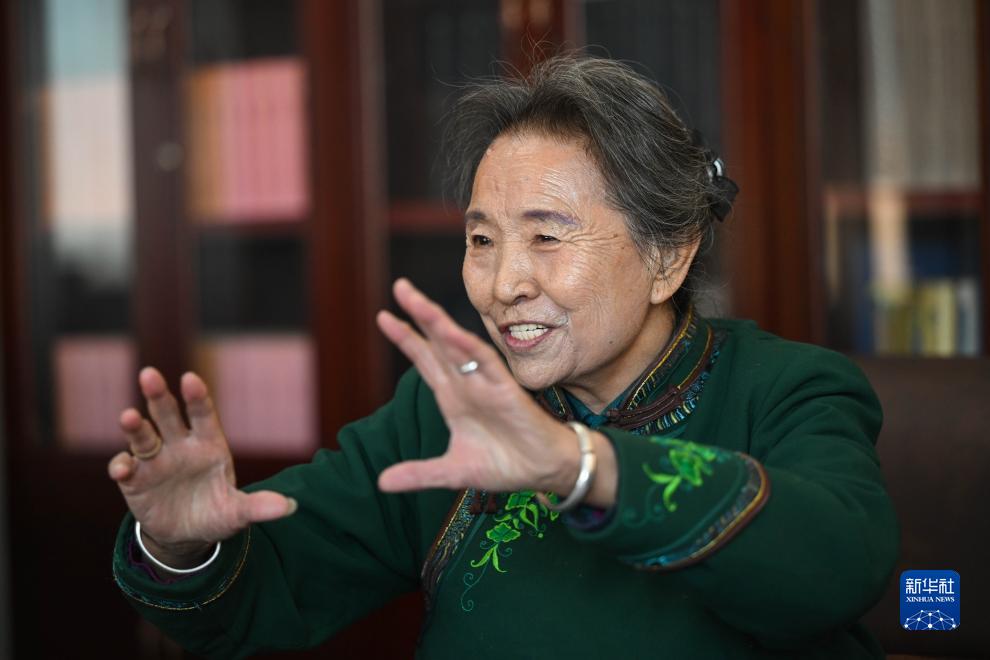 11月16日,在內蒙古阿拉善盟阿拉善左旗的馬鬃繞線蒙古族唐卡傳習所,陶格日勒在介紹蒙古族唐卡製作技藝。