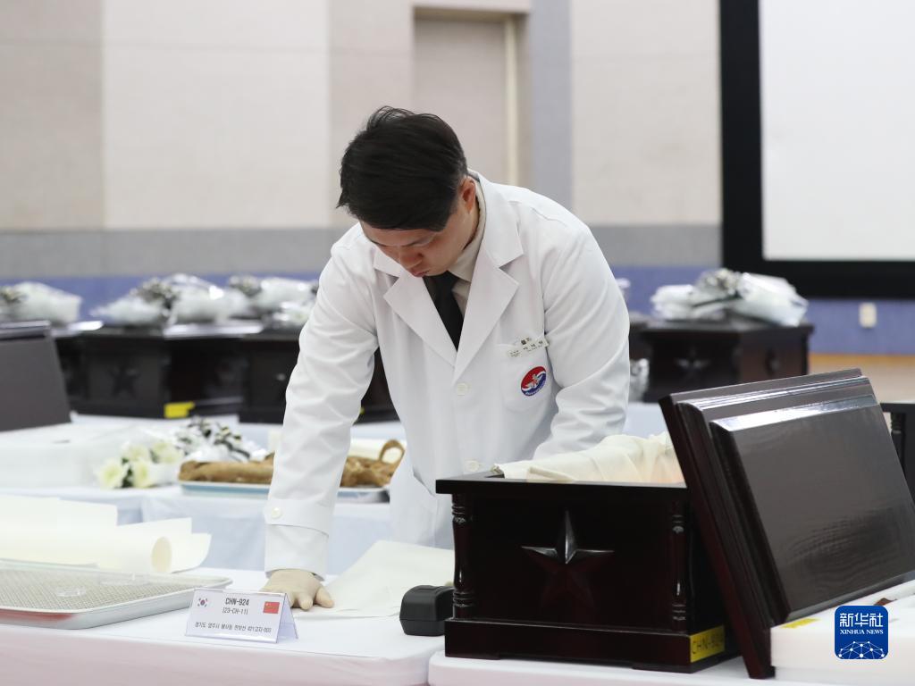 11月22日,在韓國仁川,韓方工作人員將志願軍烈士遺骸入殮。