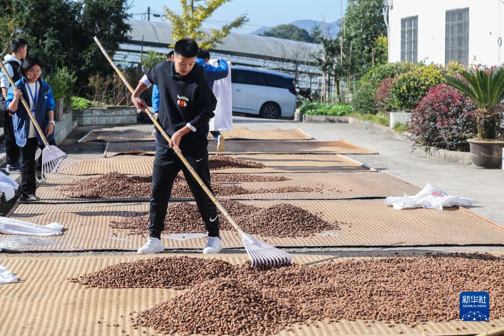 11月22日,學生在趙家鎮花明泉村明樂果業實踐基地幫助果農曬香榧。