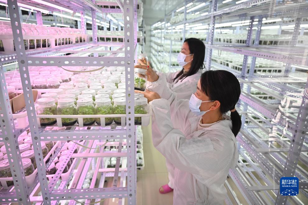 11月17日,在位於周寧縣七步鎮後洋村的福建三杉生物科技有限公司組培車間內,技術人員在查看多肉植物幼苗。
