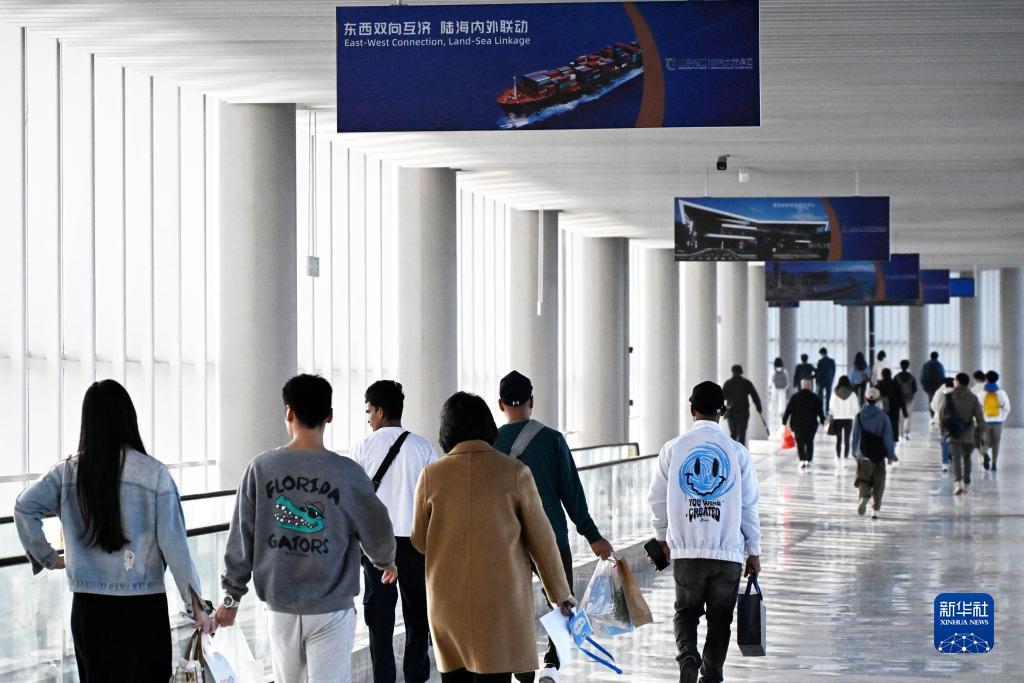 人們正通過青島郵輪母港客運中心廊橋準備登船(11月21日攝)。