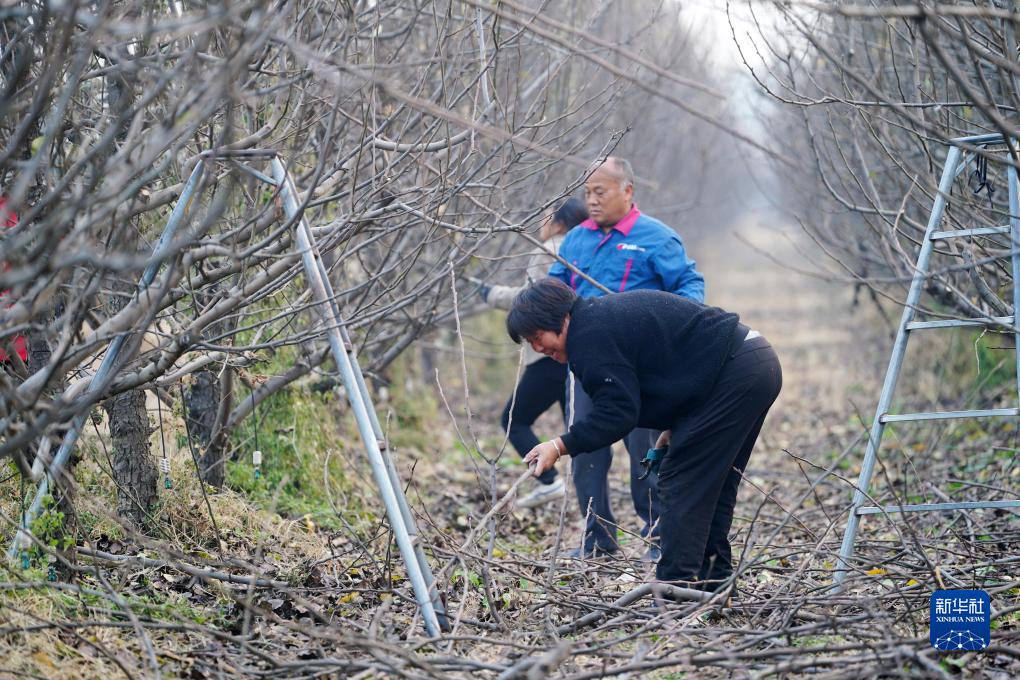 技術工人在威縣賀營鎮紅龍集村的梨園裏清理剪下的樹枝(11月21日攝)。