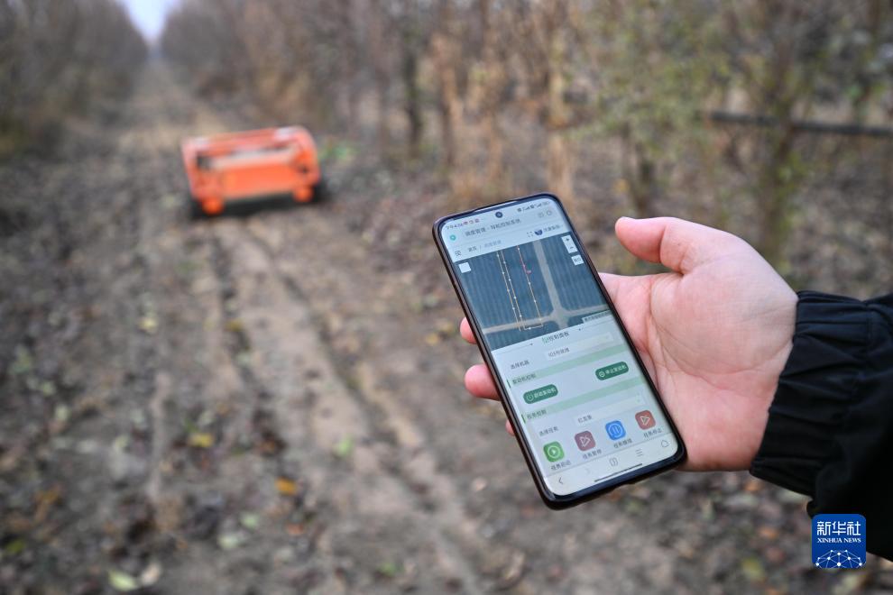 工作人員在威縣賀營鎮紅龍集村的梨園裏用手機監控無人割草機器人工作(11月21日攝)。